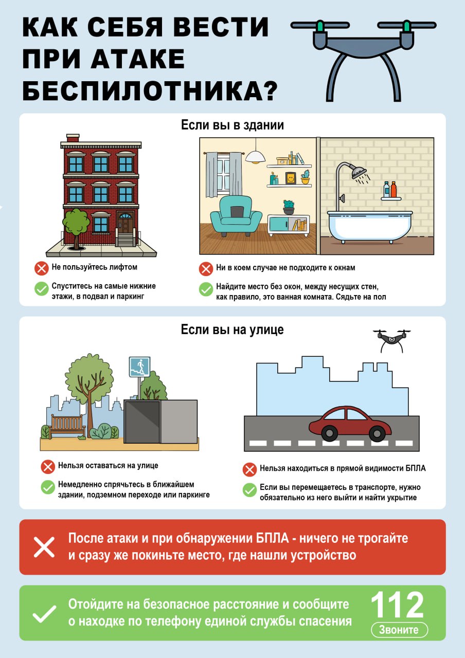 так как возможны детонация элементов БПЛА, ракет или падение элементов с крыш. При обнаружении подозрительных предметов (элементов ракет, БПЛА) необходимо обратиться в 112 и сообщить местонахождение находки, а также свои контактные данные. По возможности, предупредите людей, чтобы они не подходили к обнаруженным элементам.